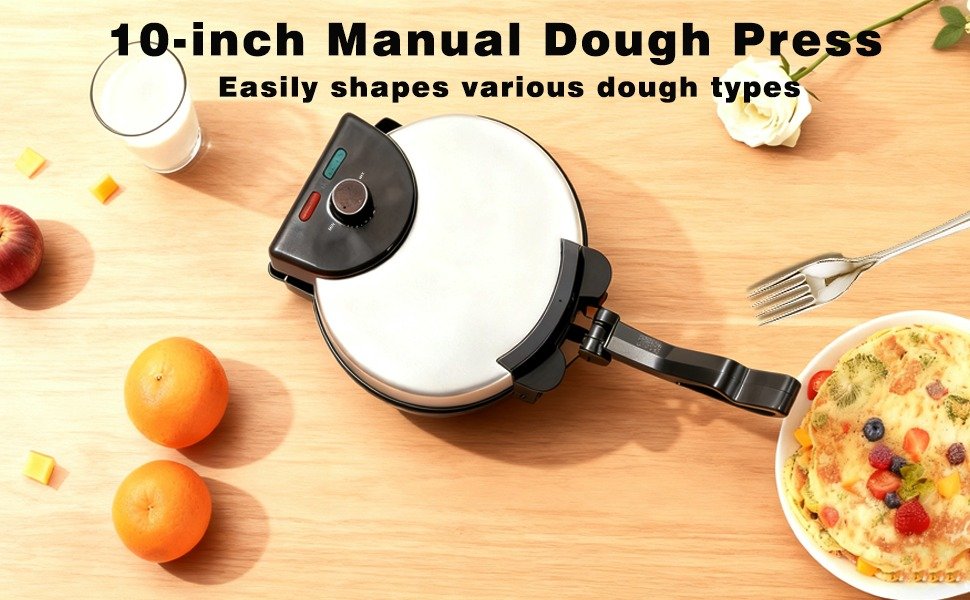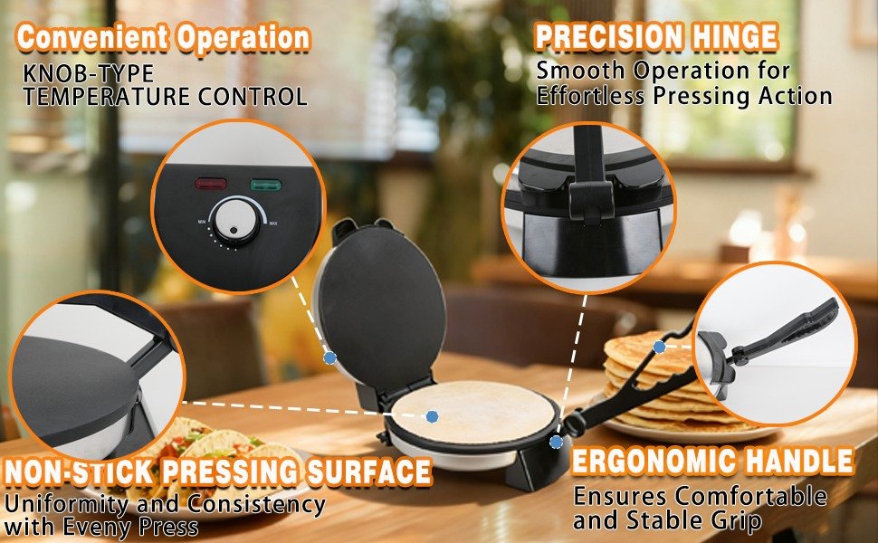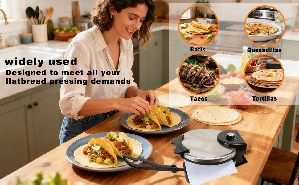 - Electric One-Touch Operation .Our Tortilla Maker Machine automatically heats and cooks perfect rounds in seconds. Simply place dough between non-stick plates – no manual pressing needed for uniform chapatis and tortillas.